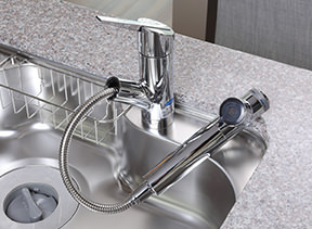 ヘッド部分が引き出せるシングルレバー式水栓を採用。デザイン性と使いやすさに配慮されています。