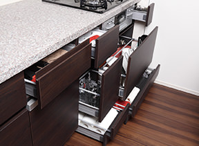 スライド収納には、ゆっくりと静かに開閉できるソフトクローズ機能付のレールが採用されています。