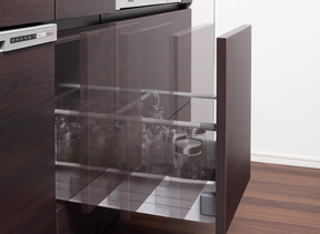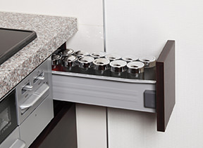 奥にしまった調理器具や小物の取り出しが簡単。重いものも安全に取り出すことができます。