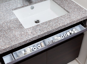 洗面ボウル前にはメイク用品などの小物が楽な姿勢で取り出せるポケット型収納が設置されています。