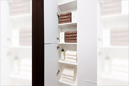 タオルなどのリネン品を豊富に収納可能。洗剤やシャンプーなど買い置きのストックにも便利です。