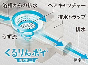 浴槽の排水を利用してうず流を発生。排水口の汚れが付きにくく、髪の毛などのゴミ捨ても簡単です。
