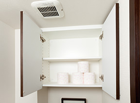 トイレットペーパーやクリーナーなどがたっぷり収納できる便利な吊戸棚が設置されています。