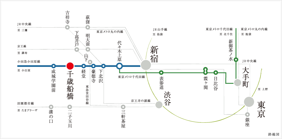 新宿をはじめ主要な都市へと結ばれる小田急小田原線。沿線には「成城」や「経堂」、「下北沢」など個性豊かな街が点在していることも魅力です。「千歳船橋」駅を中心に広がる”小田急ライフ”を楽しむことができます。