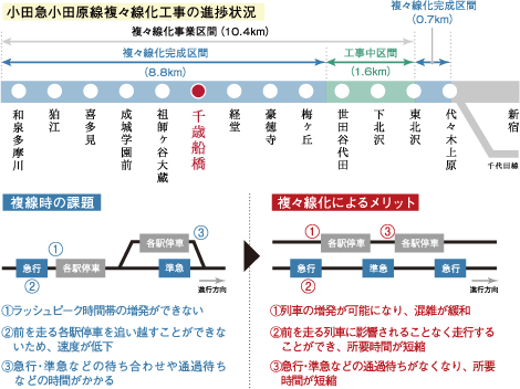 小田急電鉄では混雑を緩和し“より快適な輸送サービス”を実現するため上下線を各2本ずつ計4本の線路にする「複々線化事業」を進行中。「複々線化」が完成すると各駅停車と急行などの優等列車が別々の線路を走るため、ラッシュピーク時、優等列車の所要時間を日中並にまで短縮。