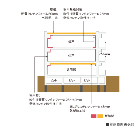 太陽熱を受けやすい屋根、外気と接する外壁、外気が伝わる最下層住戸の床下には硬質ウレタンフォームやポリスチレンフォームなどの断熱材が施されています。外の熱気や冷気から快適な室内環境を守ります。