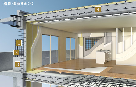 床や柱などの躯体(鉄筋コンクリート部)には、30N(ニュートン)/m㎡の強度の高いコンクリートが採用されています。その数値はおおむね1㎡のコンクリートに対して3,000トンの圧縮に耐えうる強さです。強度が高く、緻密で中性化しにくく、耐久性の高いコンクリート構造としています。