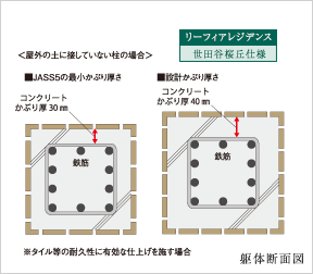 中性化と鉄筋のサビによるコンクリートの腐食・ひび割れを防ぐためには、鉄筋を包むコンクリートの厚み(かぶり厚)が適度に確保されていなければなりません。本建物では、JASS5で規定されている最小かぶり厚+10mmを設計かぶり厚さとし、屋外の土に接していない部分の柱・梁・耐力壁で、耐久性上有効な仕上げを施す場合の設計かぶり厚さで40mm等とされています。