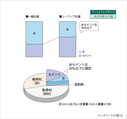 コンクリート強度と耐久性を左右する水セメント比(セメントに対する水の比率)を50%以下に抑え、より高いコンクリート強度が実現されています。水の比率が高いと、コンクリートの中性化が早まり、コンクリート自体の寿命を縮めてしまうことになります。これを防ぐために独自の基準を設け、配合の段階から劣化の軽減が図られています。