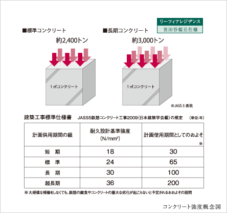 ※日本建築学会の鉄筋コンクリート工事標準仕様書(通称JASS5)に基づき大規模補修不要予定期間が100年(理論値)と想定されています。 ※表記の数値は、コンクリートの耐久性のみを示した理論値で、マンションのメンテナンスが100年不要ということではありません。 ※杭・外構工事を除く