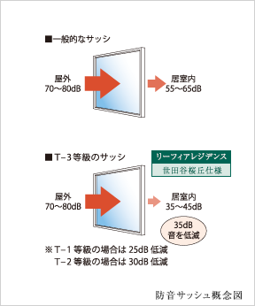 ※外部の発生音により室内の音環境への影響は異なります。※サッシ等級値は、JISで定める音に関する評価基準であり、実際に取り付けられた住戸では、その等級値と異なる場合があります。※実際の住戸では通気口その他の開口部があるため、遮音性は取り付けられたサッシの遮音性能より低下するのが通例とされています。