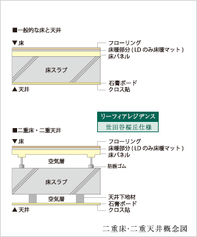 床材を防振ゴム付の支持脚で床スラブから浮かせた二重構造を採用。床材の床軽量衝撃音低減性能は⊿LL(Ⅱ)-3です。また天井においても二重天井とし、配管を直接スラブに埋め込んでいないため、メンテナンス性の向上とともに、将来のリフォームにも対応することができます。