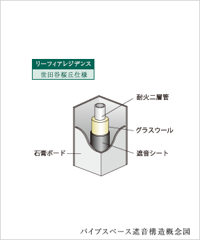 住戸内排水竪管の通るパイプスペースで、居室に隣接する部分には、排水竪管にグラスウールと遮音シートを巻き付けた上、石膏ボードを2枚貼りとした遮音対策が施されています。