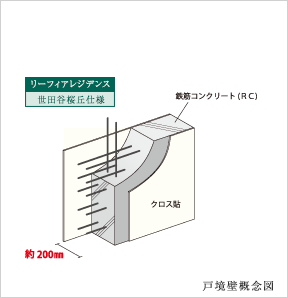 隣戸からの生活騒音には、隣戸との間の壁である戸境壁の厚さを厚くすることが効果的です。本物件では、鉄筋コンクリートで約200mmの厚さが確保され、遮音性とプライバシーに配慮されています。(一部乾式間仕切あり)