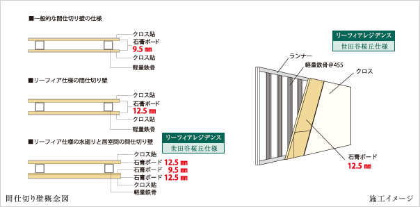 居室と他の居室間の壁※1を12.5mmの石膏ボード貼りにされています。また、居室と水廻りの間の壁※2は石膏ボード片面2枚貼りとした遮音対策が施されています。